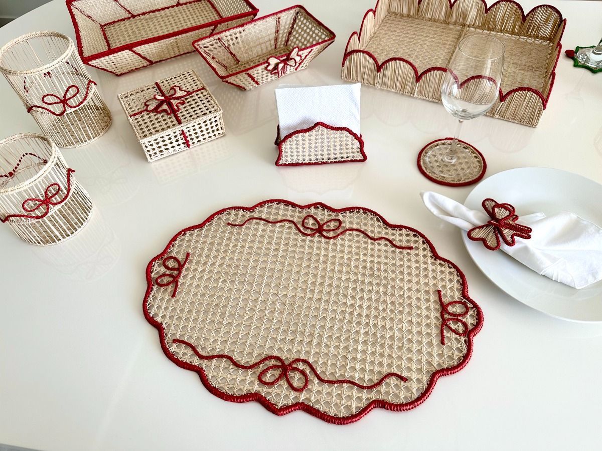 Bring timeless elegance to your holiday table with our Christmas Placemat – Handwoven Iraca Palm with Red Trim.